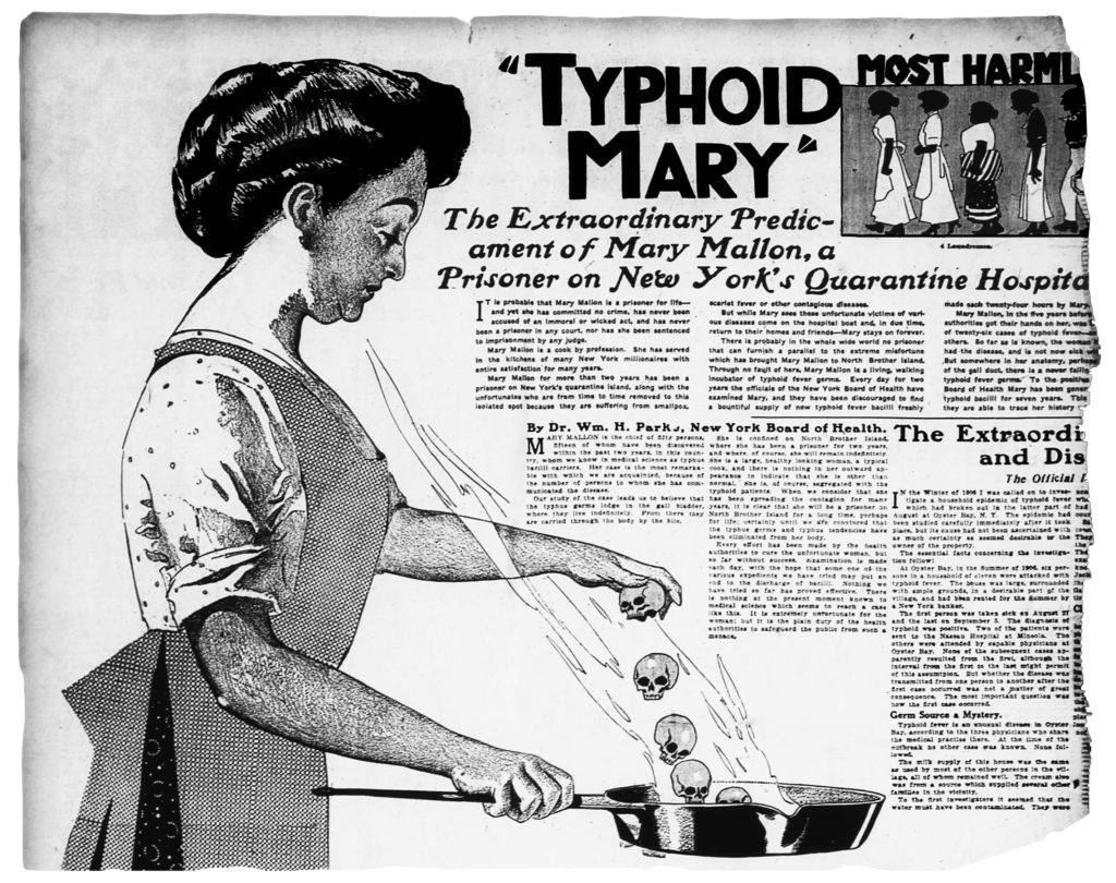 Who has not heard of the sad case of “Typhoid Mary?” A fascinating book titled Medical Voodoo by Annis Riley Hale tells the story of “Typhoid Mary”. Mary, a maidservant of the better class in New York City, in the summer of 1907, was working where several cases of typhoid developed. Because Mary did not fall ill with the fever, though in contact with the patients, the only explanation that ‘medical science’ could offer for such a phenomenon was that the woman was a “typhoid carrier.” There was absolutely no evidence or proof of it except the health officer’s wild guess. Much contrary evidence was offered by Mary and her friends, but she was arrested, charged with ‘a menace to public health, branded “Typhoid Mary” in the newspapers and imprisoned in the isolation hospital on North Brothers Island.”