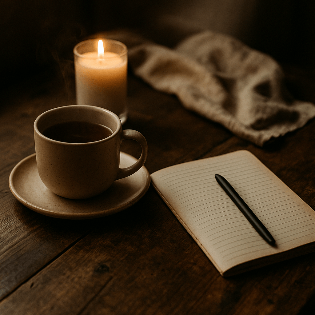 friends, therapy notes, a dog, AI, spiritual books, and coffee cups — the true support crew.