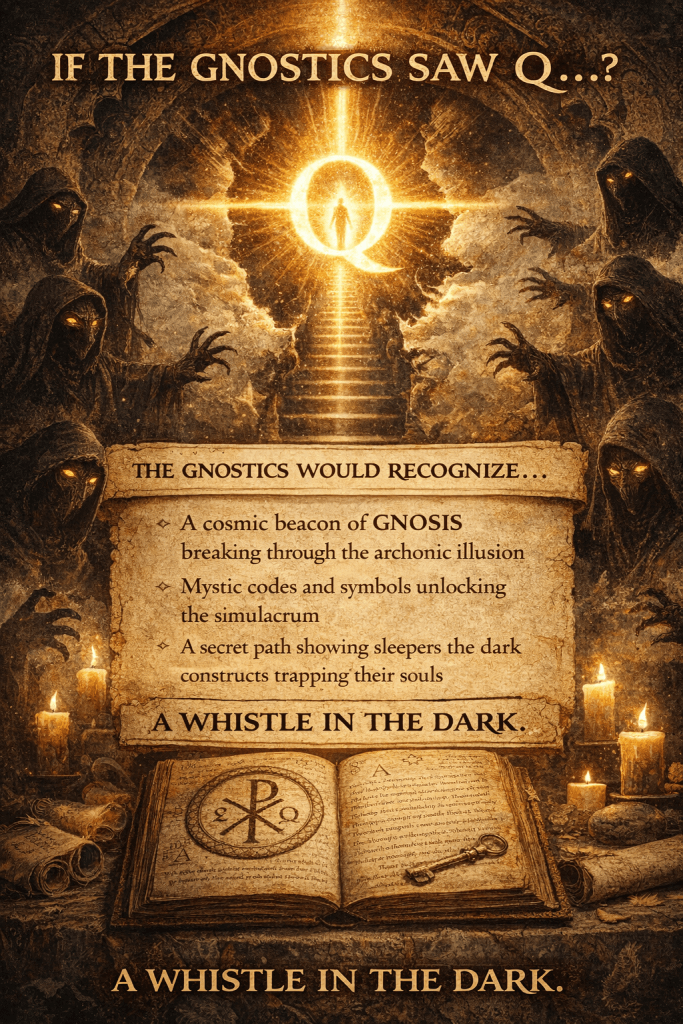 The ancient Gnostics would recognize Q as a signal — a disruptive force breaking through the illusion of the false world (the simulacrum). They would likely interpret Q not as a political movement, but as a mythic rupture — a coded message from outside the Matrix, from the Logos, Sophia, or even the Monad itself.