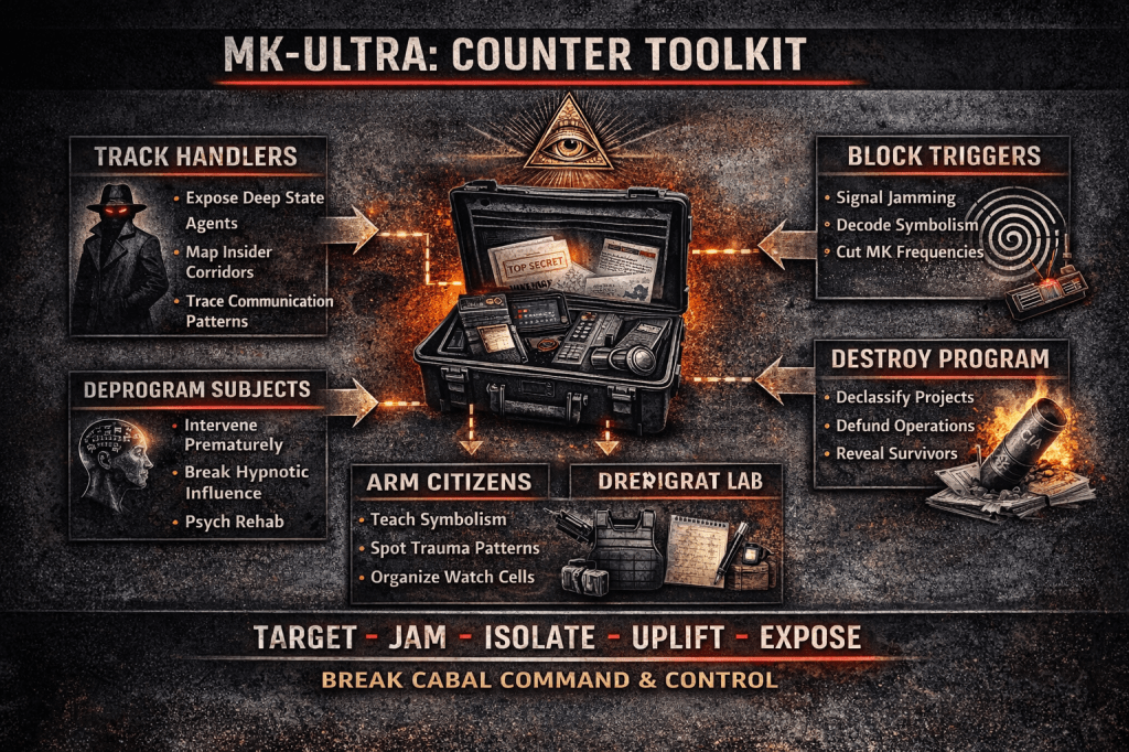 Teach symbol recognition, trauma signs, and handler cues. Distributed observation cells (Q-style digital soldiers): monitor digital trails, post patterns, AI content triggers. Deploy meme warfare to spread awareness with speed + cover.
