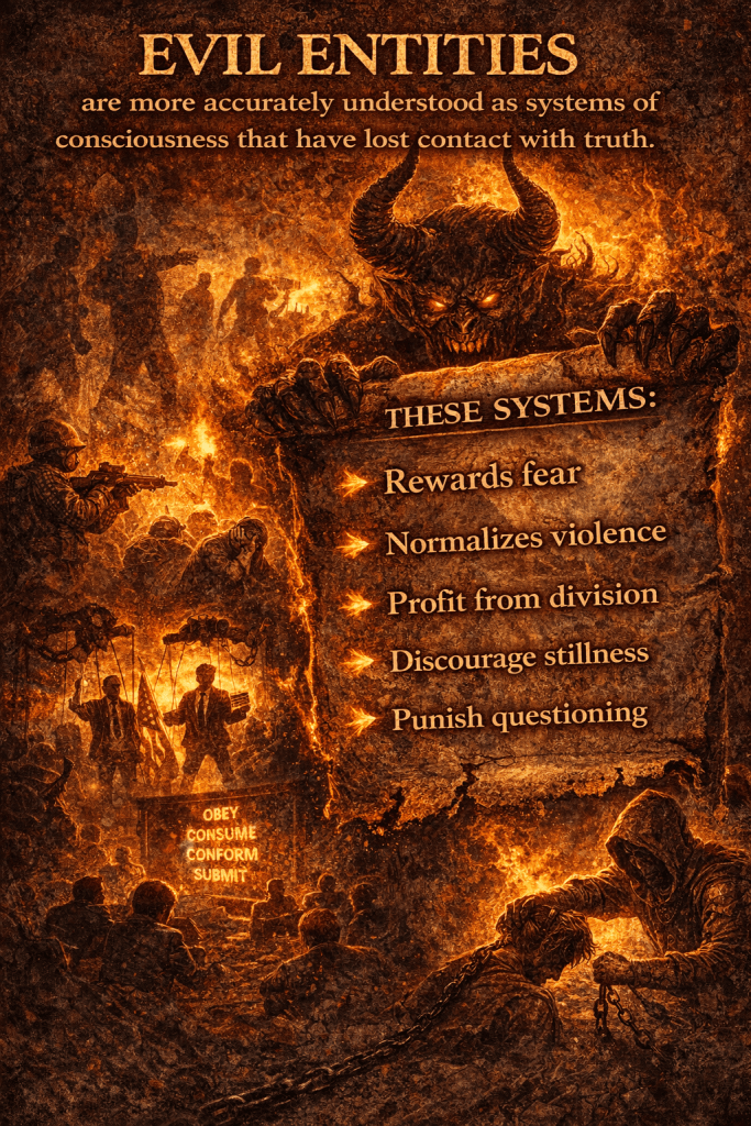 “Evil entities “ is more accurately understood as systems of consciousness that have lost contact with truth. Theses systems: